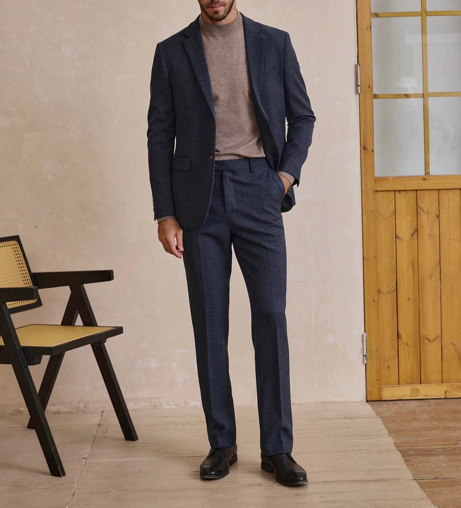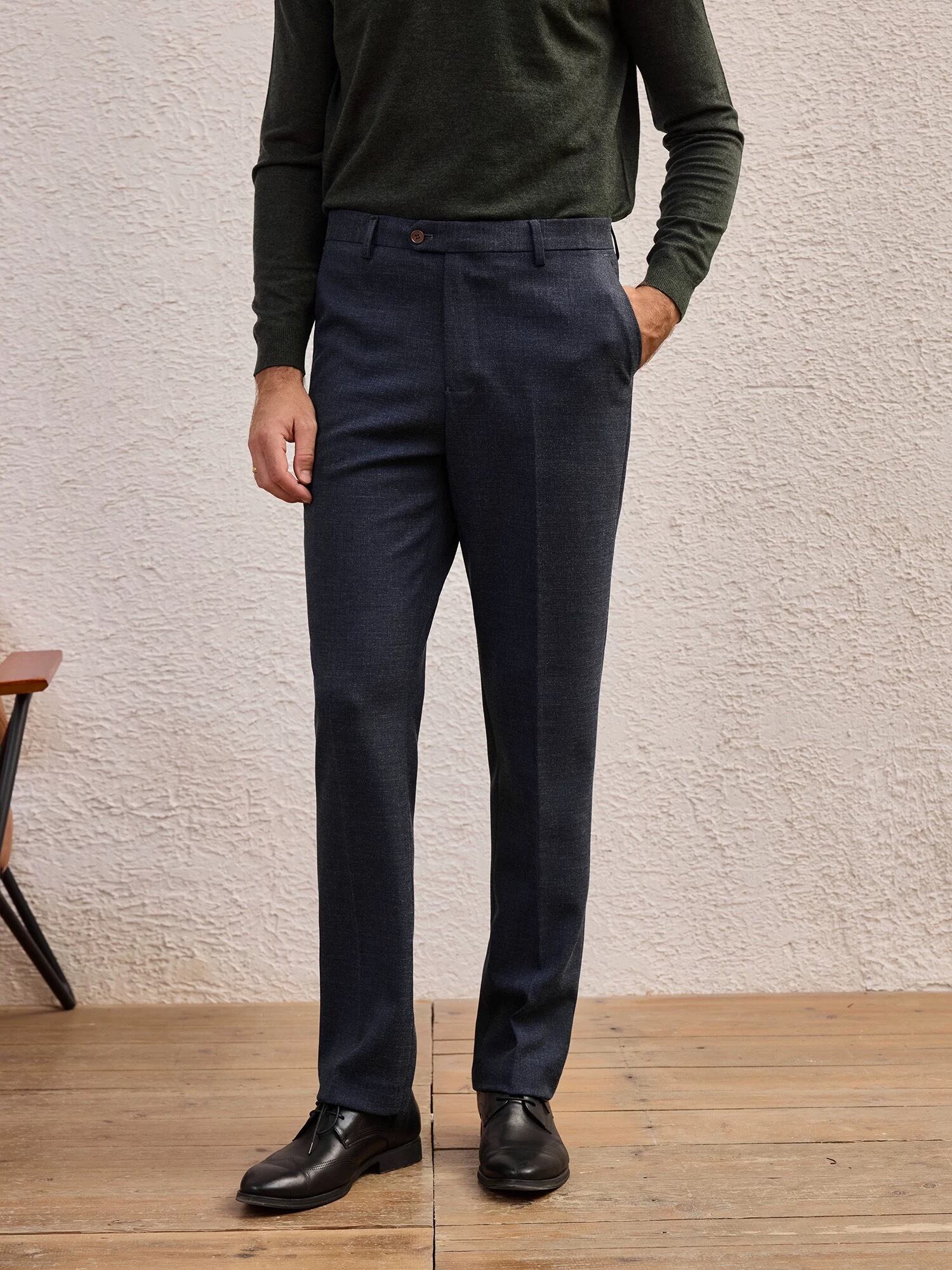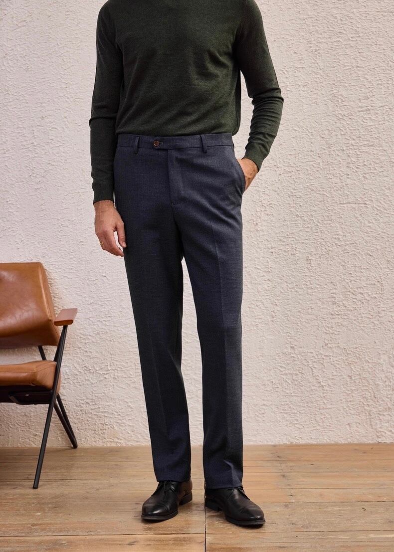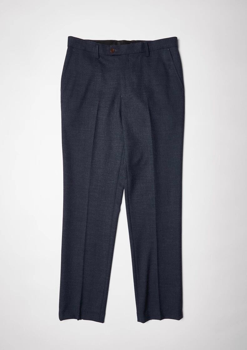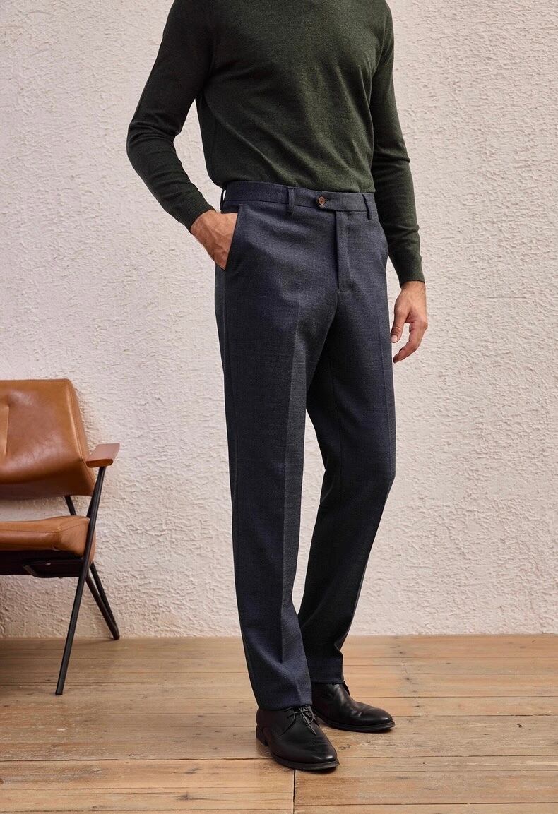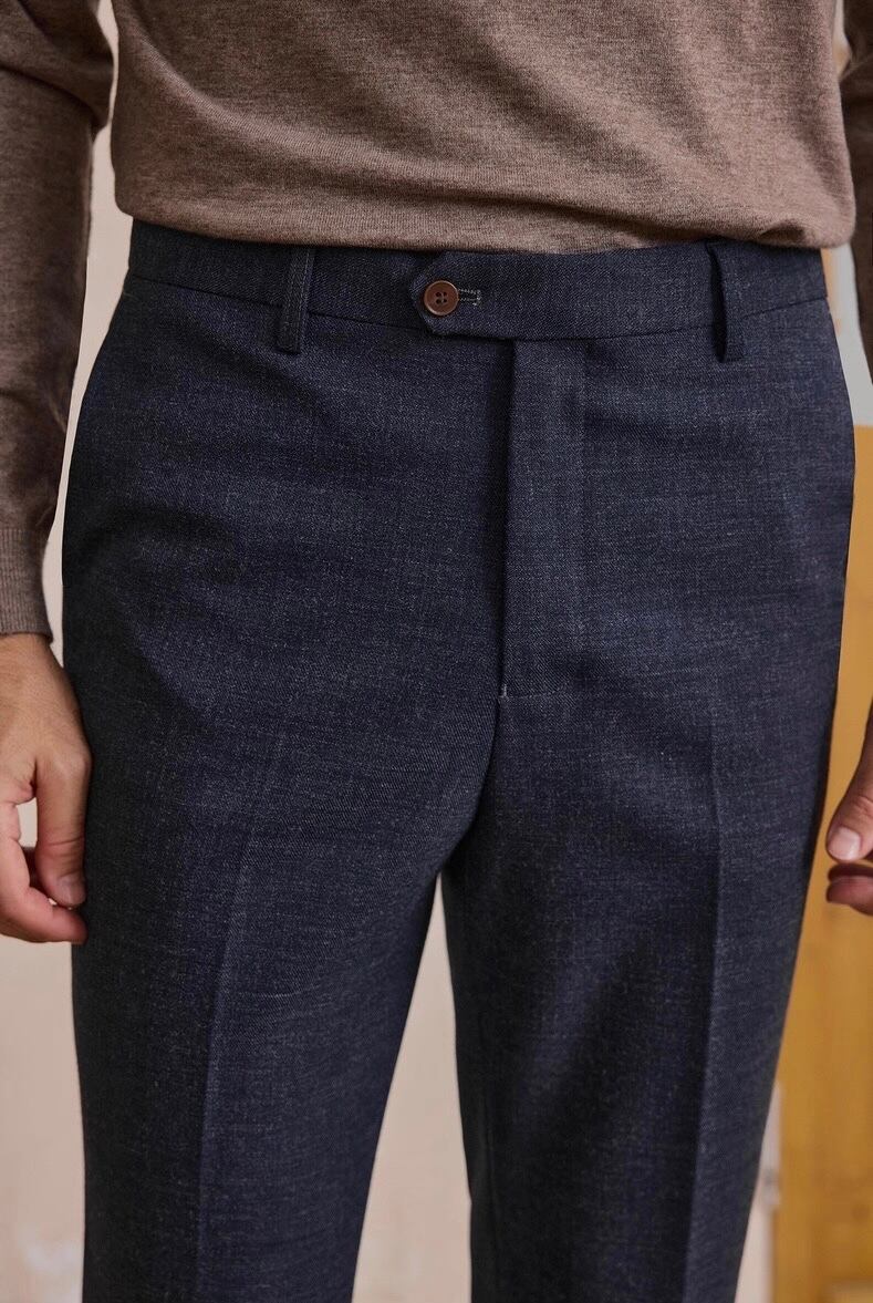 洗練された印象を与えるダークブルースラックスです!深みのあるブルーが配色となり、ビジネスシーンからカジュアルな場面まで幅広く対応可能です。しっかりとした素材感と快適な履き心地が特徴で、日常のコーディネートに最適です。セットアップとしての着用もでき、コーディネートの幅が広がります。