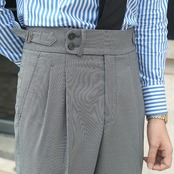 千鳥柄はクラシックながらも洗練された雰囲気を醸し出し、大人の男性にふさわしいスタイルを叶えるベルトレススラックスをお試しください。