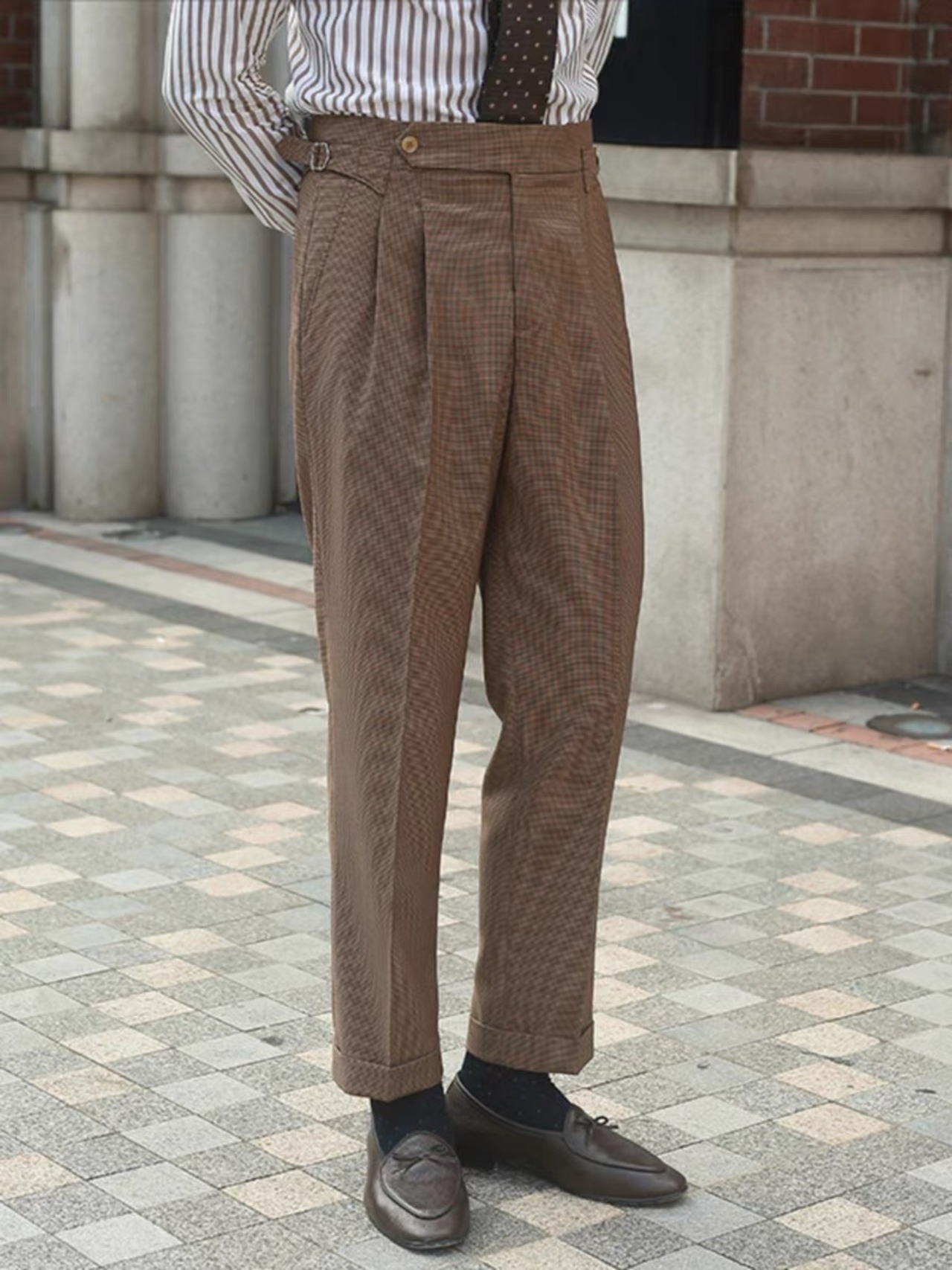 エレガントな千鳥格子が印象的なナポリクラシックベルトレススラックスです。洗練されたデザインとシルエットが、ビジネスシーンやフォーマルな場面での装いに相応しい一本。「着心地」と「見た目の美しさ」にこだわりを持った、大人の男性にふさわしいアイテムです。